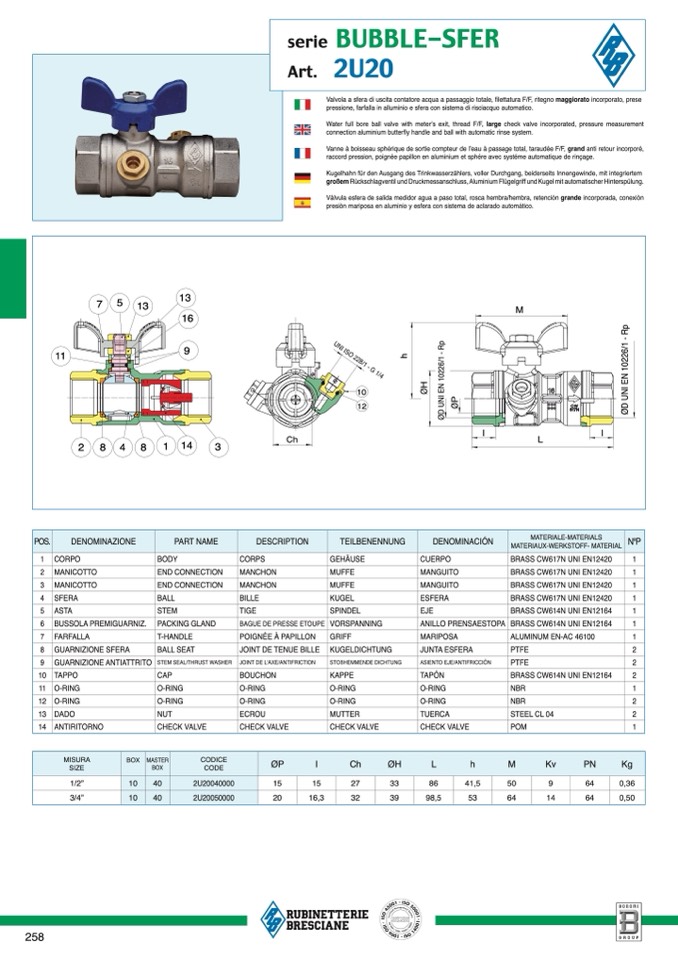 Valvola a sfera di uscita contatore acqua a passaggio totale, filettatura F/F, ritegno maggiorato incorporato, pres