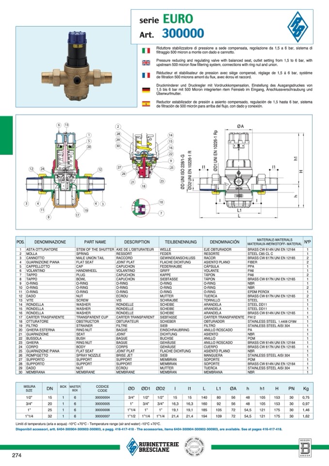 Riduttore stabilizzatore di pressione a sede compensata, regolazione da 1,5 a 6 bar, sistema d