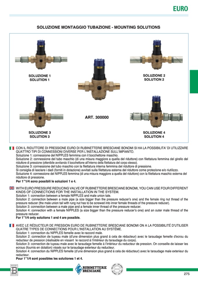 WITH EURO PRESSURE REDUCING VALVE OF RUBINETTERIE BRESCIANE BONOMI, YOU CAN USE FOUR DIFFEREN