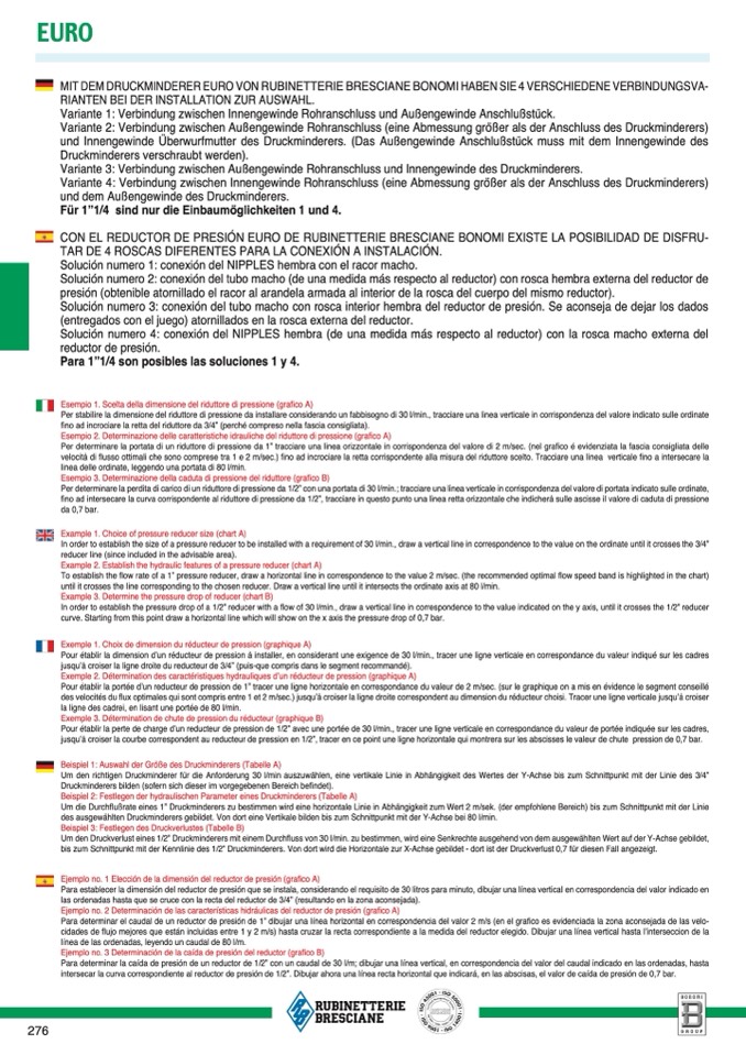 Pour établir la perte de charge d’un reducteur de pression de 1/2” avec une portée de 30 l/min., tracer une ligne verticale en correspondance du valeur de portée indiquée sur les cadres,