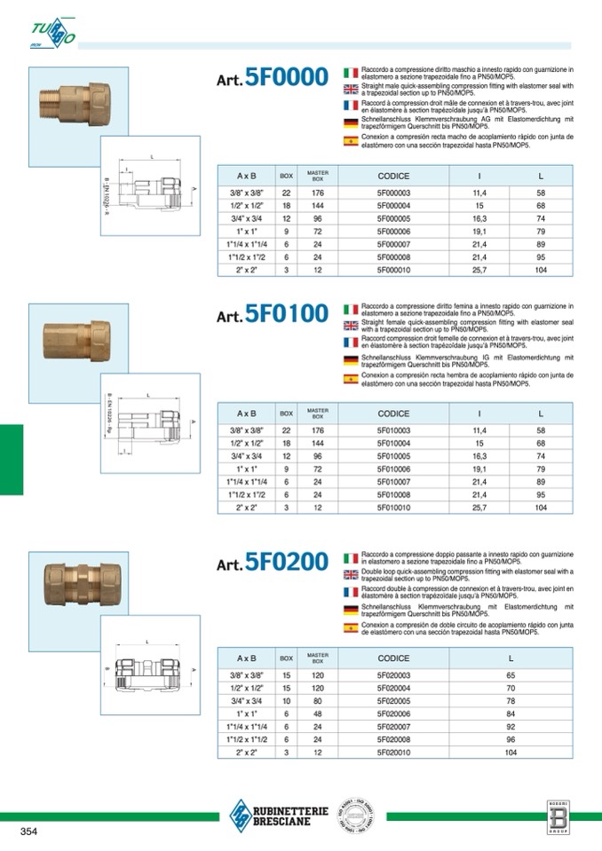 Raccordo a compressione diritto femina a innesto rapido con guarnizione in