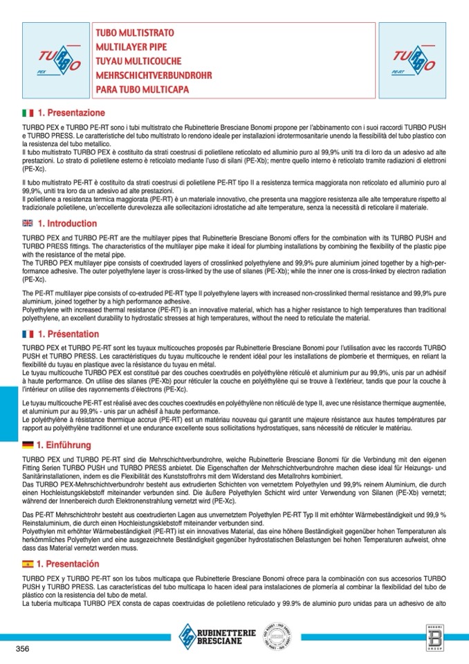 TURBO PEX und TURBO PE-RT sind die Mehrschichtverbundrohre, welche Rubinetterie Bresciane Bonomi für die Verbindung mit den eigenen