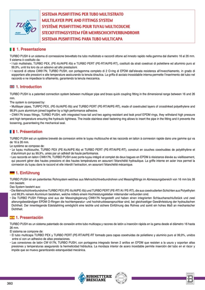 TURBO PUSH es un sistema patentado de conexión entre tubo multicapa y racores de latón a inserción rápida en la gama desde el diámetro 16 hast