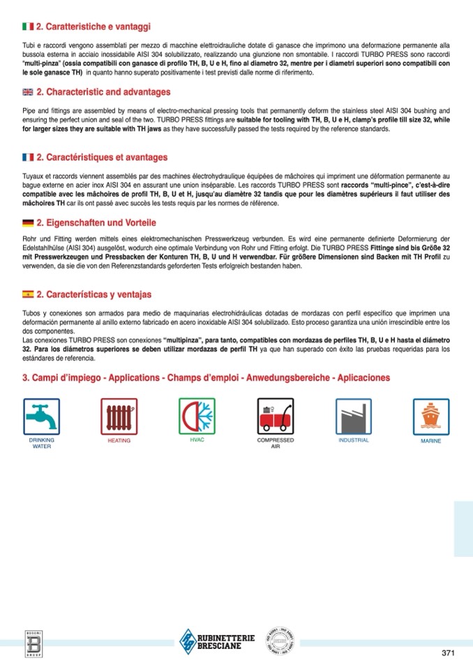 bague externe en acier inox AISI 304 en assurant une union inséparable. Les raccords TURBO PRESS sont raccords “multi-pince”, c’est-à-dire
