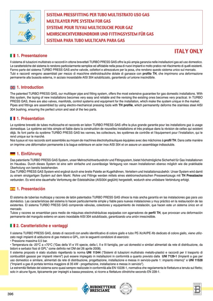 Il sistema di tubazioni multistrato e raccordi in ottone brevettati TURBO PRESS GAS offre la più ampia garanzia nelle installazioni gas ad uso domestico.