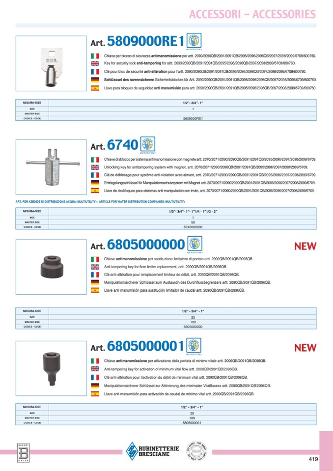 Anti-tampering key for flow limiter replacement, artt. 2090QB/2091QB/2096QB.
