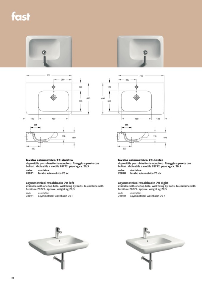 lavabo asimmetrico 70 sx