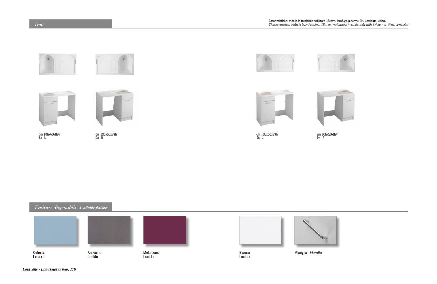 Characteristics: particle board cabinet 18 mm. Waterproof in conformity with EN norms. Gloss laminate.