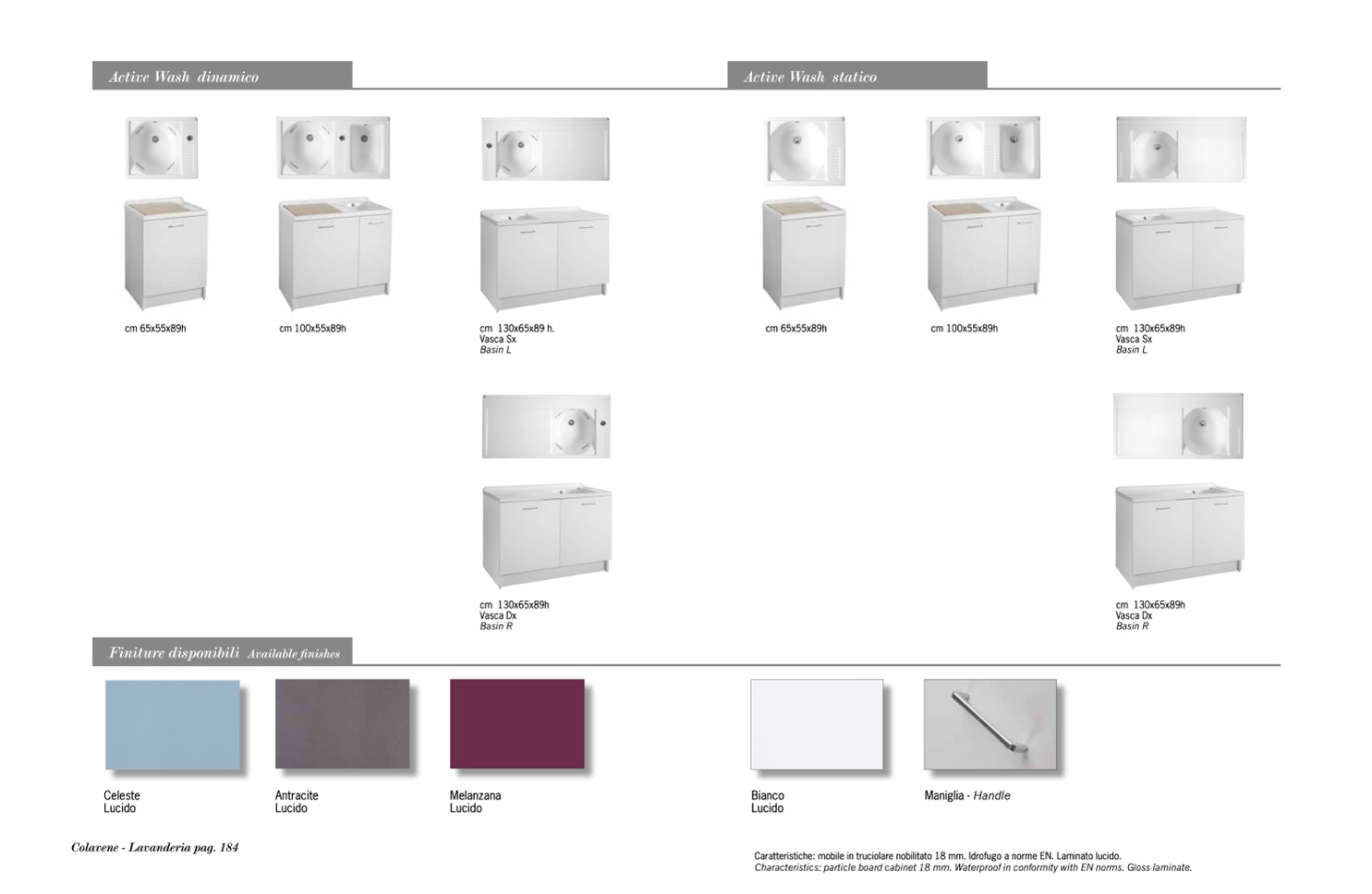 Characteristics: particle board cabinet 18 mm. Waterproof in conformity with EN norms. Gloss laminate.