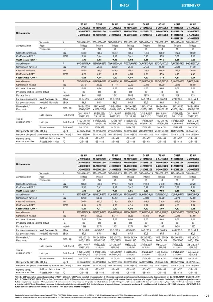 Condizioni di operatività: Raffrescamento interno 27 °C DB / 19 °C WB. Raffrescamento esterno 35 °C DB / 24 °C WB. Riscaldamento interno 20 °C DB. Riscaldamento esterno 7 °C DB / 6 °C WB. (DB: Bulbo secco; WB: Bulbo umido). Specifiche soggette a