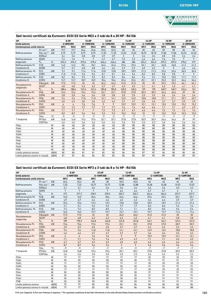 1) Pc out= Capacità. 2) Pec out= Potenza in ingresso. * Per qualsiasi condizione di test fate riferimento al sito web ufficiale (https://www.eurovent-certification.com/en).