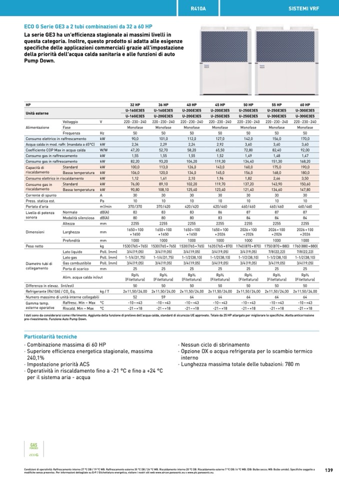 Condizioni di operatività: Raffrescamento interno 27 °C DB / 19 °C WB. Raffrescamento esterno 35 °C DB / 24 °C WB. Riscaldamento interno 20 °C DB. Riscaldamento esterno 7 °C DB / 6 °C WB. (DB: Bulbo secco; WB: Bulbo umido). Specifiche soggette a