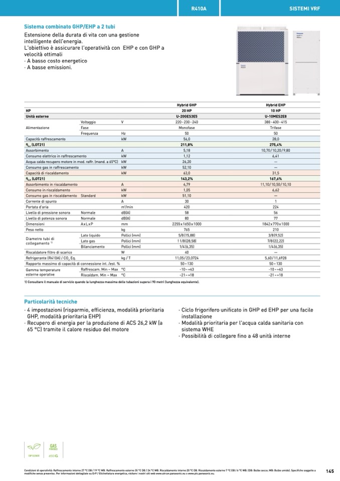 Condizioni di operatività: Raffrescamento interno 27 °C DB / 19 °C WB. Raffrescamento esterno 35 °C DB / 24 °C WB. Riscaldamento interno 20 °C DB. Riscaldamento esterno 7 °C DB / 6 °C WB. (DB: Bulbo secco; WB: Bulbo umido). Specifiche soggette a