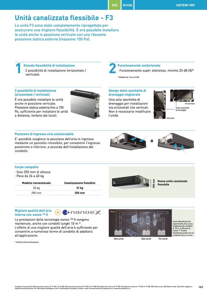 Condizioni di operatività: Raffrescamento interno 27 °C DB / 19 °C WB. Raffrescamento esterno 35 °C DB / 24 °C WB. Riscaldamento interno 20 °C DB. Riscaldamento esterno 7 °C DB / 6 °C WB. (DB: Bulbo secco; WB: Bulbo umido). Specifiche soggette a