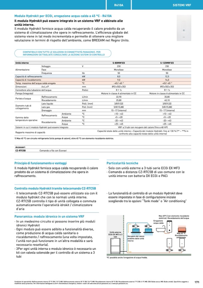 Condizioni di operatività: Raffrescamento interno 27 °C DB / 19 °C WB. Raffrescamento esterno 35 °C DB / 24 °C WB. Riscaldamento interno 20 °C DB. Riscaldamento esterno 7 °C DB / 6 °C WB. (DB: Bulbo secco; WB: Bulbo umido). Specifiche soggette a