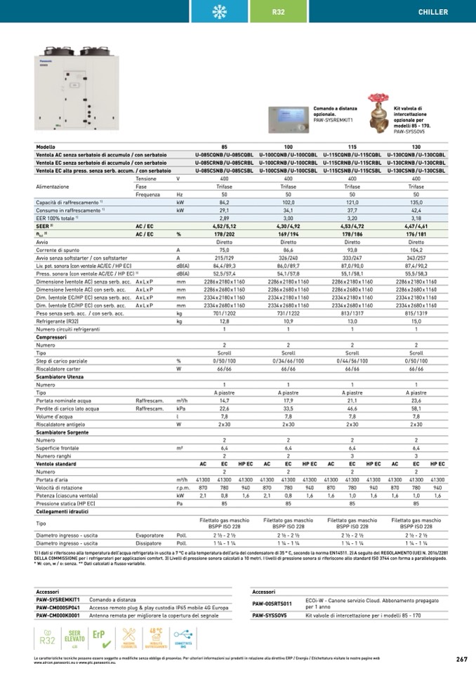 1) I dati si riferiscono alla temperatura dell’acqua refrigerata in uscita a 7 °C e alla temperatura dell’aria del condensatore di 35 ° C, secondo la norma EN14511. 2) A seguito del REGOLAMENTO (UE) N. 2016/2281