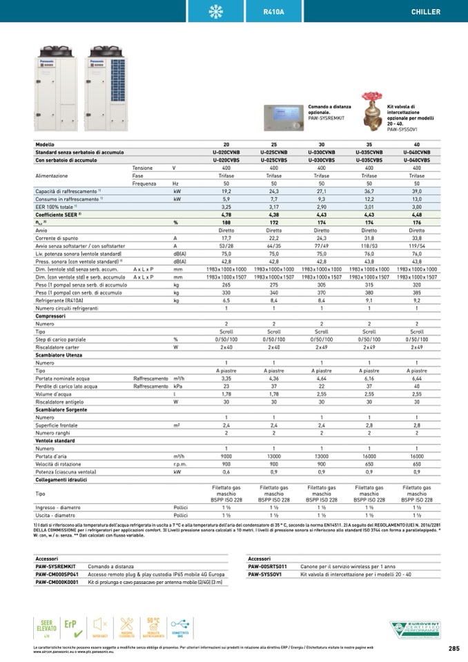 1) I dati si riferiscono alla temperatura dell’acqua refrigerata in uscita a 7 °C e alla temperatura dell’aria del condensatore di 35 ° C, secondo la norma EN14511. 2) A seguito del REGOLAMENTO (UE) N. 2016/2281