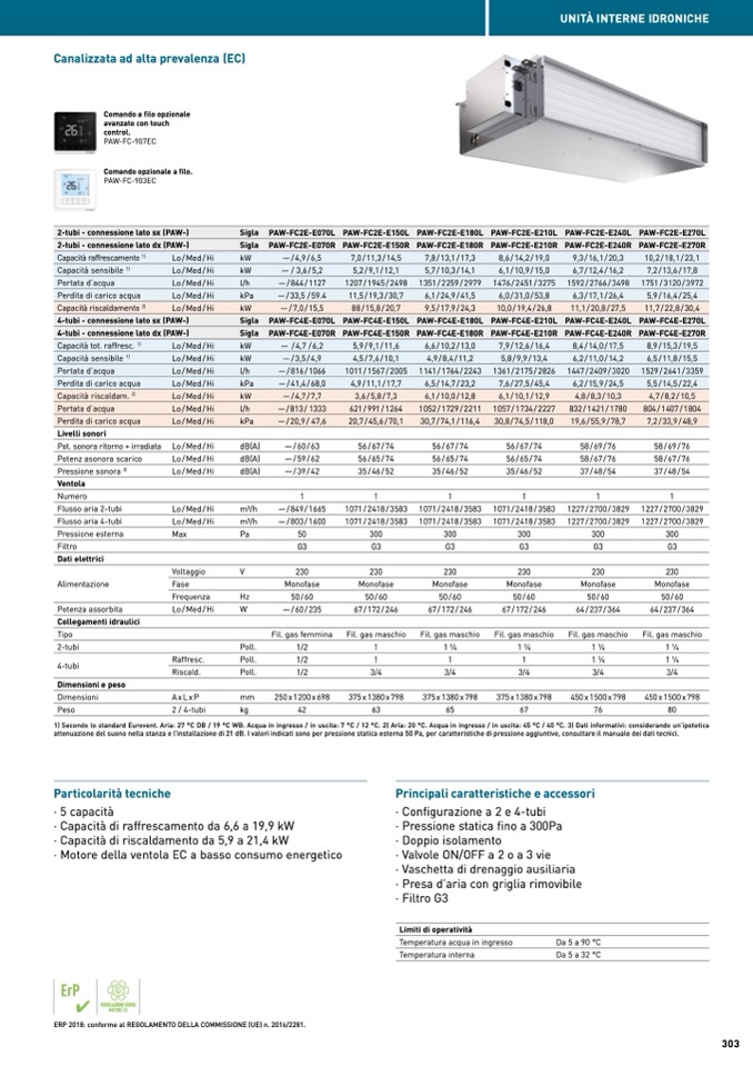 1) Secondo lo standard Eurovent. Aria: 27 °C DB / 19 °C WB. Acqua in ingresso / in uscita: 7 °C / 12 °C. 2) Aria: 20 °C. Acqua in ingresso / in uscita: 45 °C / 40 °C. 3) Dati informativi: considerando un’ipotetica