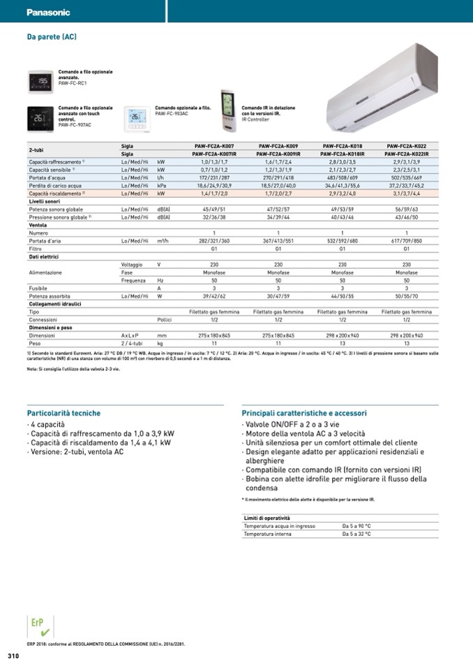 1) Secondo lo standard Eurovent. Aria: 27 °C DB / 19 °C WB. Acqua in ingresso / in uscita: 7 °C / 12 °C. 2) Aria: 20 °C. Acqua in ingresso / in uscita: 45 °C / 40 °C. 3) I livelli di pressione sonora si basano sulle