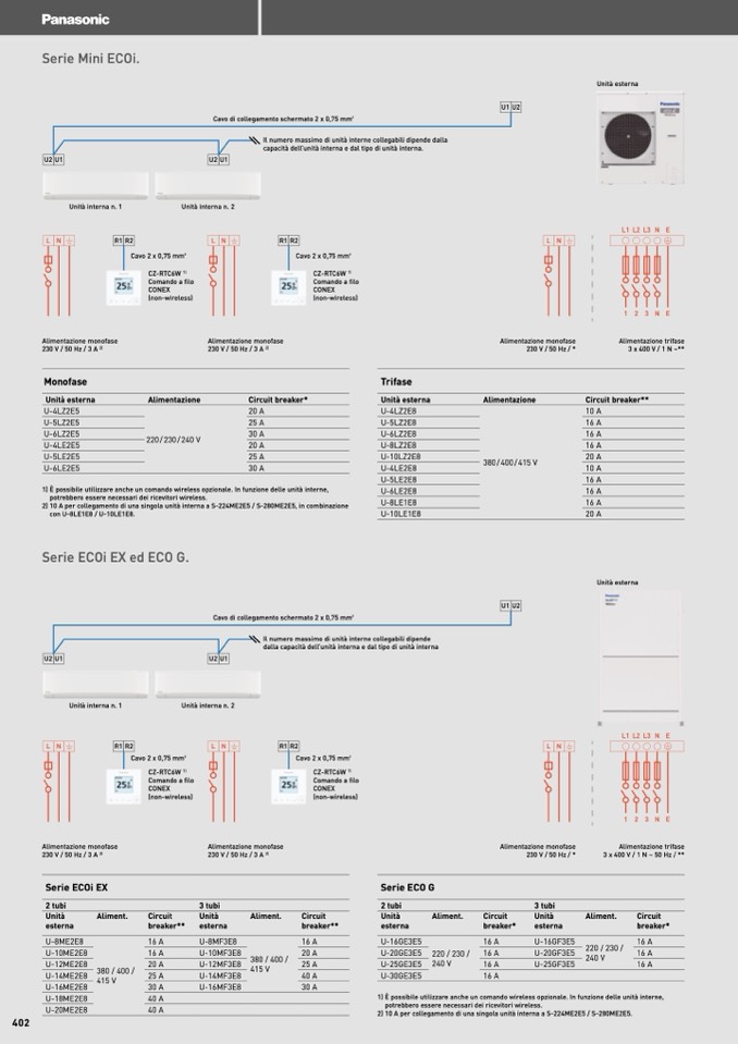 2) 10 A per collegamento di una singola unità interna a S-224ME2E5 / S-280ME2E5, in combinazione