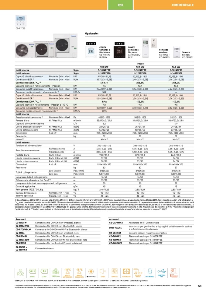 SEER: per S-1014PF3E + U-100PZ3E5. SCOP: per S-6071PF3E + U-60PZ3E5A. SUPER QUIET: per S-3650PF3E + U-36PZ3E5. INTERNET CONTROL: opzionale.