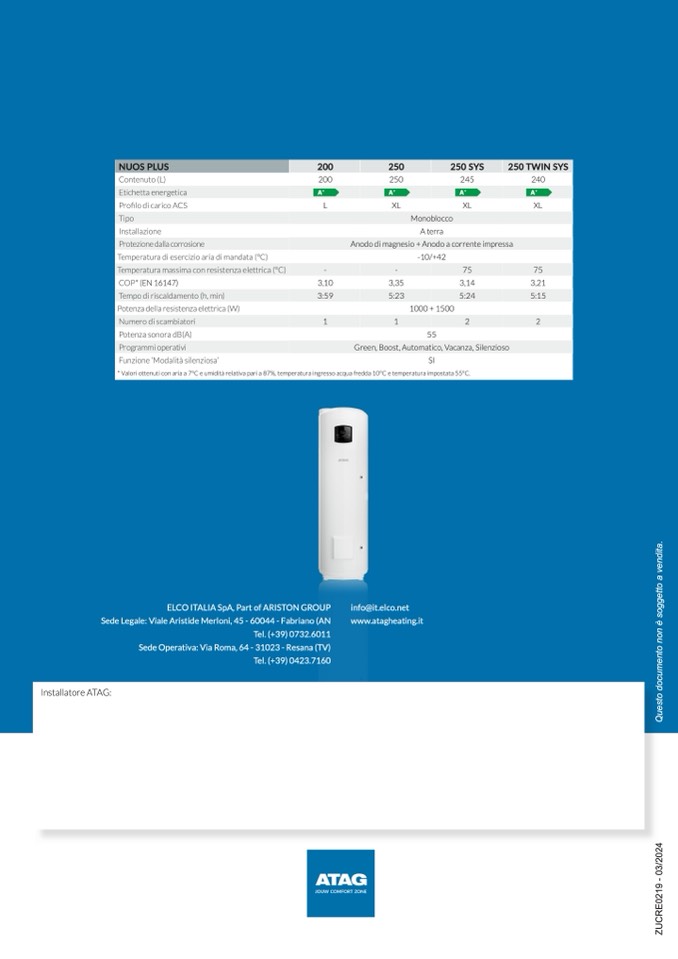 * Valori ottenuti con aria a 7°C e umidità relativa pari a 87%, temperatura ingresso acqua fredda 10°C e temperatura impostata 55°C.
