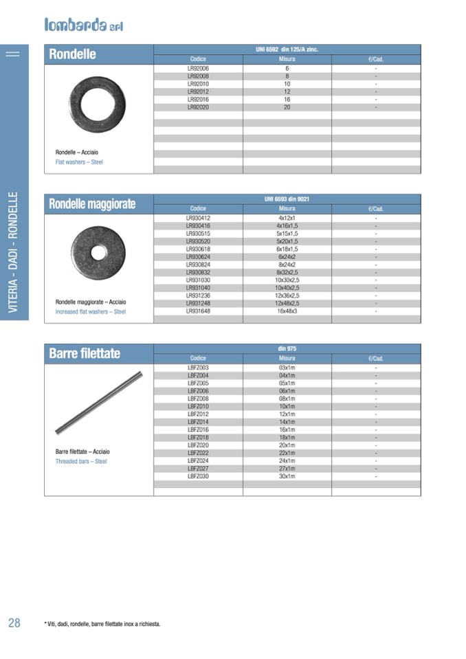 * Viti, dadi, rondelle, barre filettate inox a richiesta.