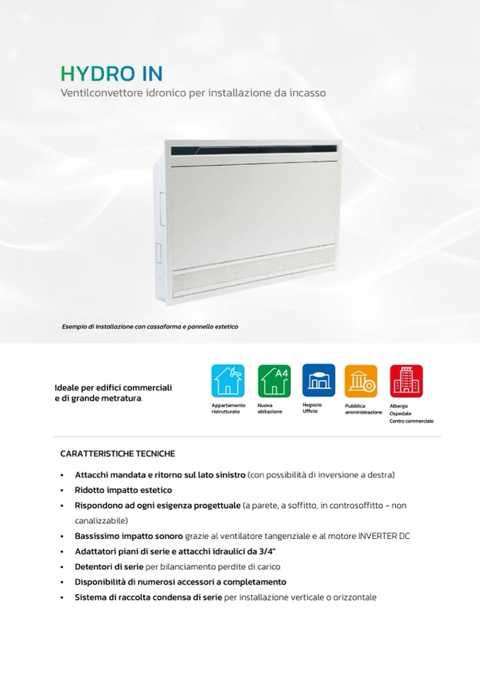 Ventilconvettore idronico per installazione da incasso