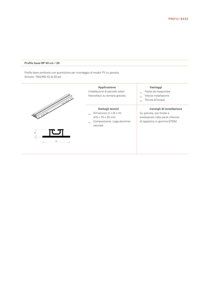 Profilo base preforato con guarnizione per montaggio di moduli FV su grecata