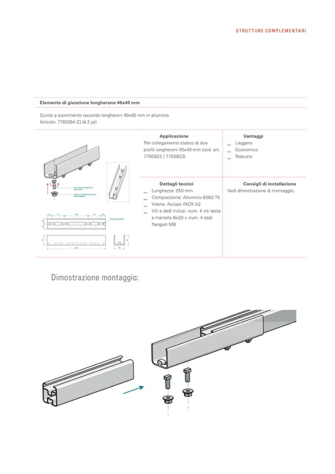 Giunto a scorrimento raccordo longheroni 40x40 mm in alluminio