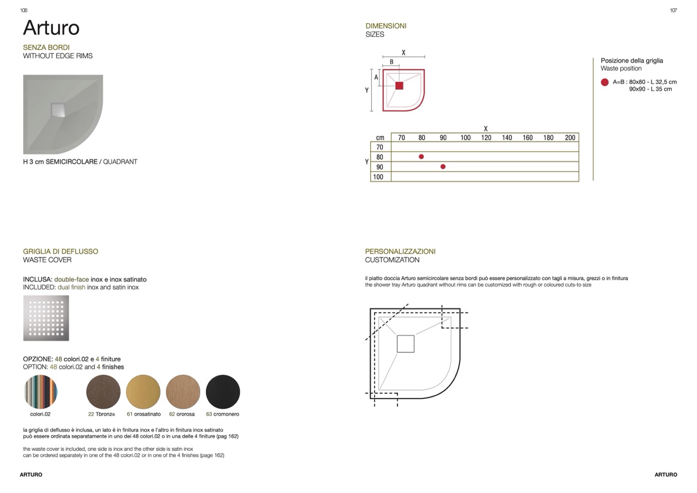 il piatto doccia Arturo semicircolare senza bordi può essere personalizzato con tagli a misura, grezzi o in
