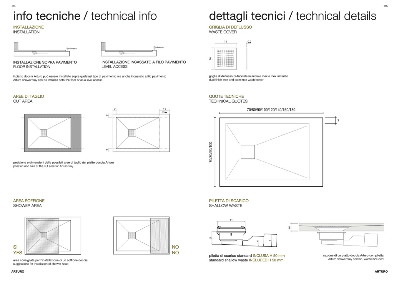 posizione e dimensioni delle possibili aree di taglio del piatto doccia Arturo