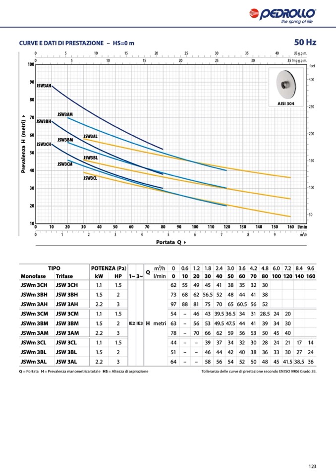 Q = Portata H = Prevalenza manometrica totale HS = Altezza di aspirazione