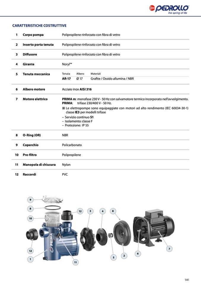 PRIMA m: monofase 230 V - 50 Hz con salvamotore termico incorporato nell'avvolgimento.