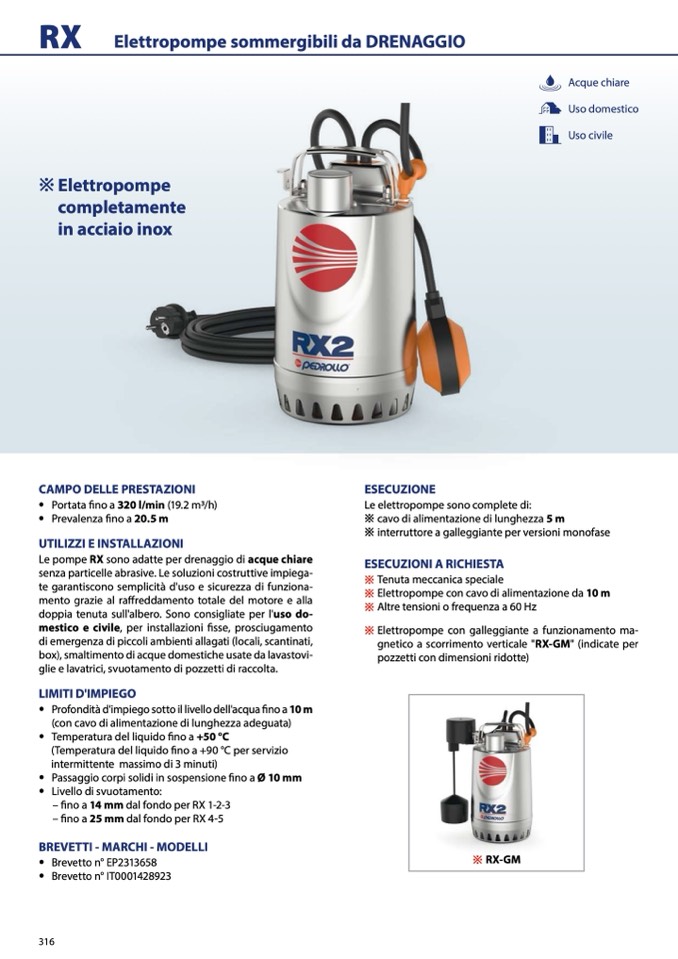 Le pompe RX sono adatte per drenaggio di acque chiare