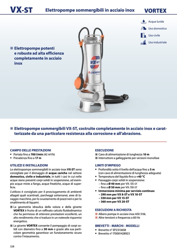 ※ Elettropompe sommergibili VX-ST, costruite completamente in acciaio inox e carat-