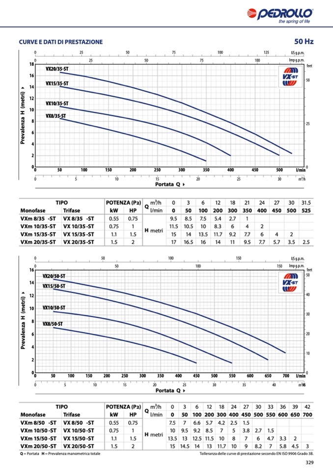Tolleranza delle curve di prestazione secondo EN ISO 9906 Grado 3B.