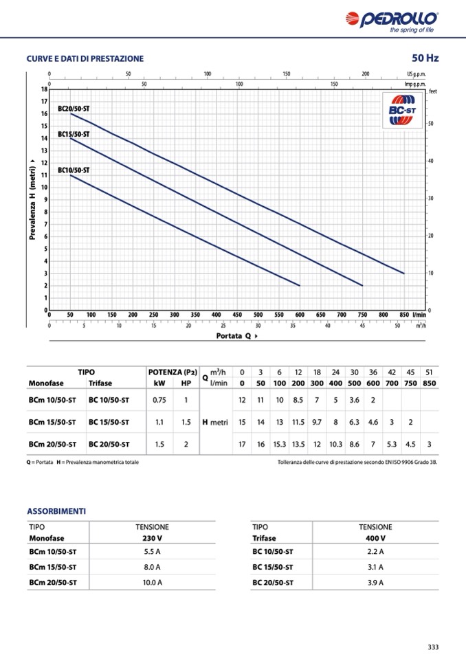 Tolleranza delle curve di prestazione secondo EN ISO 9906 Grado 3B.