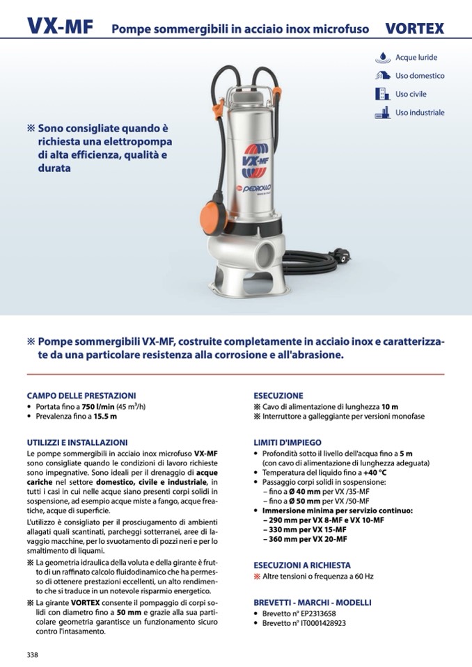 ※ Pompe sommergibili VX-MF, costruite completamente in acciaio inox e caratterizza-