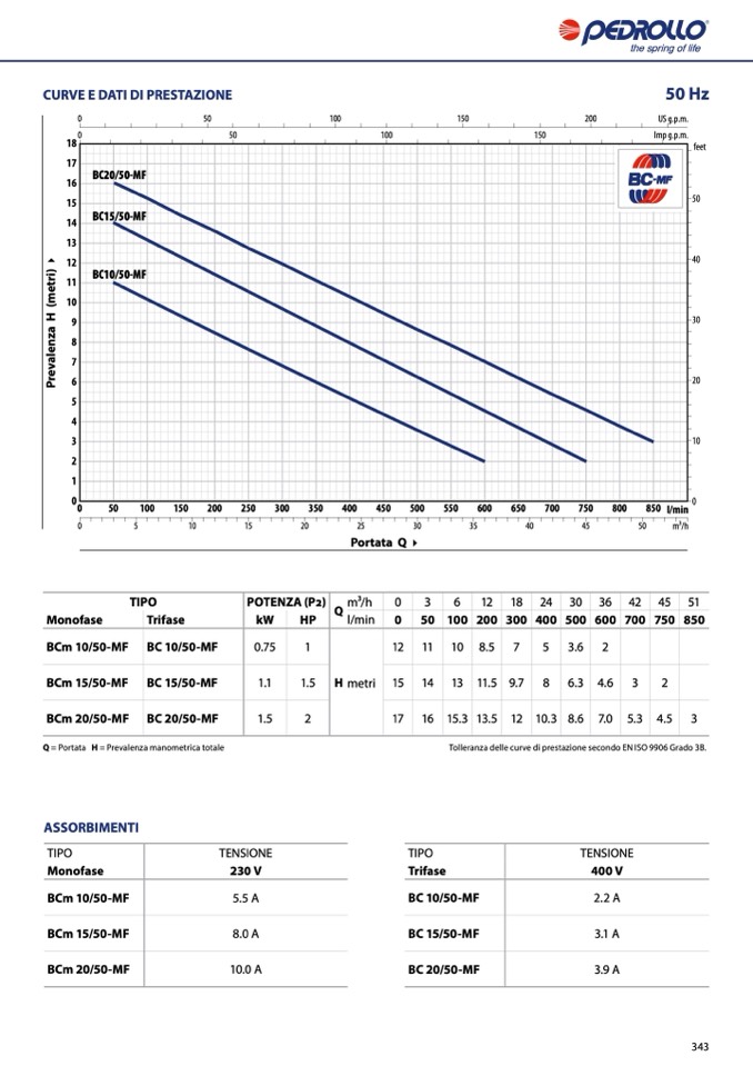 Tolleranza delle curve di prestazione secondo EN ISO 9906 Grado 3B.