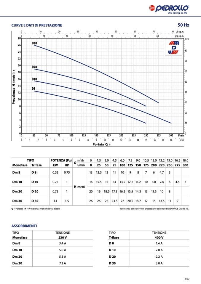 Tolleranza delle curve di prestazione secondo EN ISO 9906 Grado 3B.