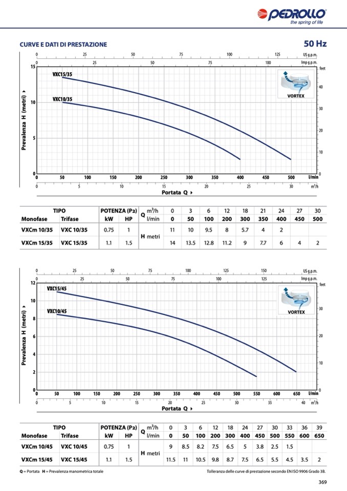 Tolleranza delle curve di prestazione secondo EN ISO 9906 Grado 3B.