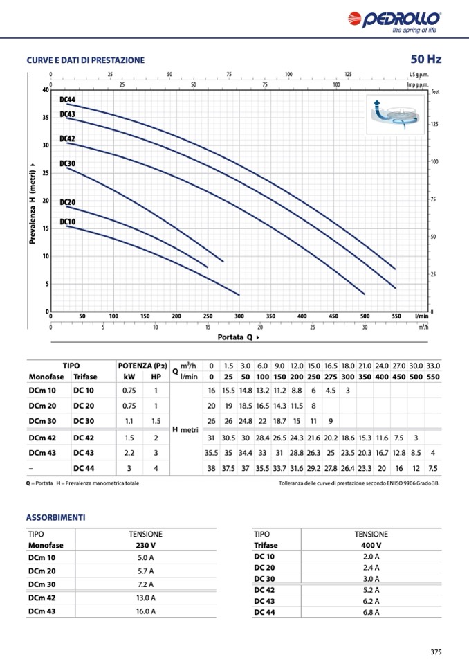 Tolleranza delle curve di prestazione secondo EN ISO 9906 Grado 3B.
