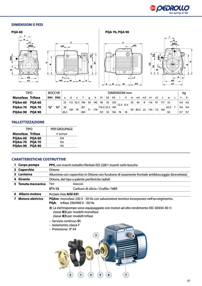 PQAm: monofase 230 V - 50 Hz con salvamotore termico incorporato nell'avvolgimento.