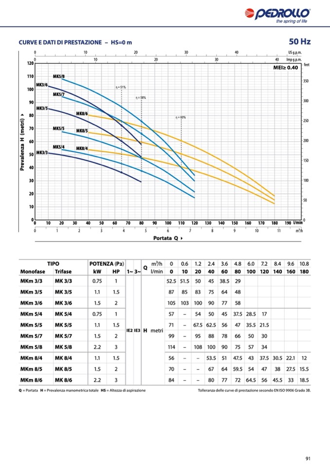 Q = Portata H = Prevalenza manometrica totale HS = Altezza di aspirazione