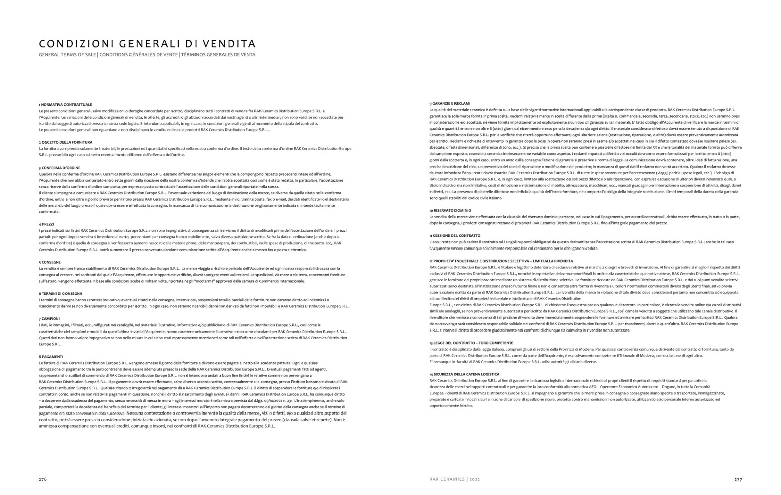 Le presenti condizioni generali, salvo modificazioni o deroghe concordate per iscritto, disciplinano tutti i contratti di vendita fra RAK Ceramics Distribution Europe S.R.L. e