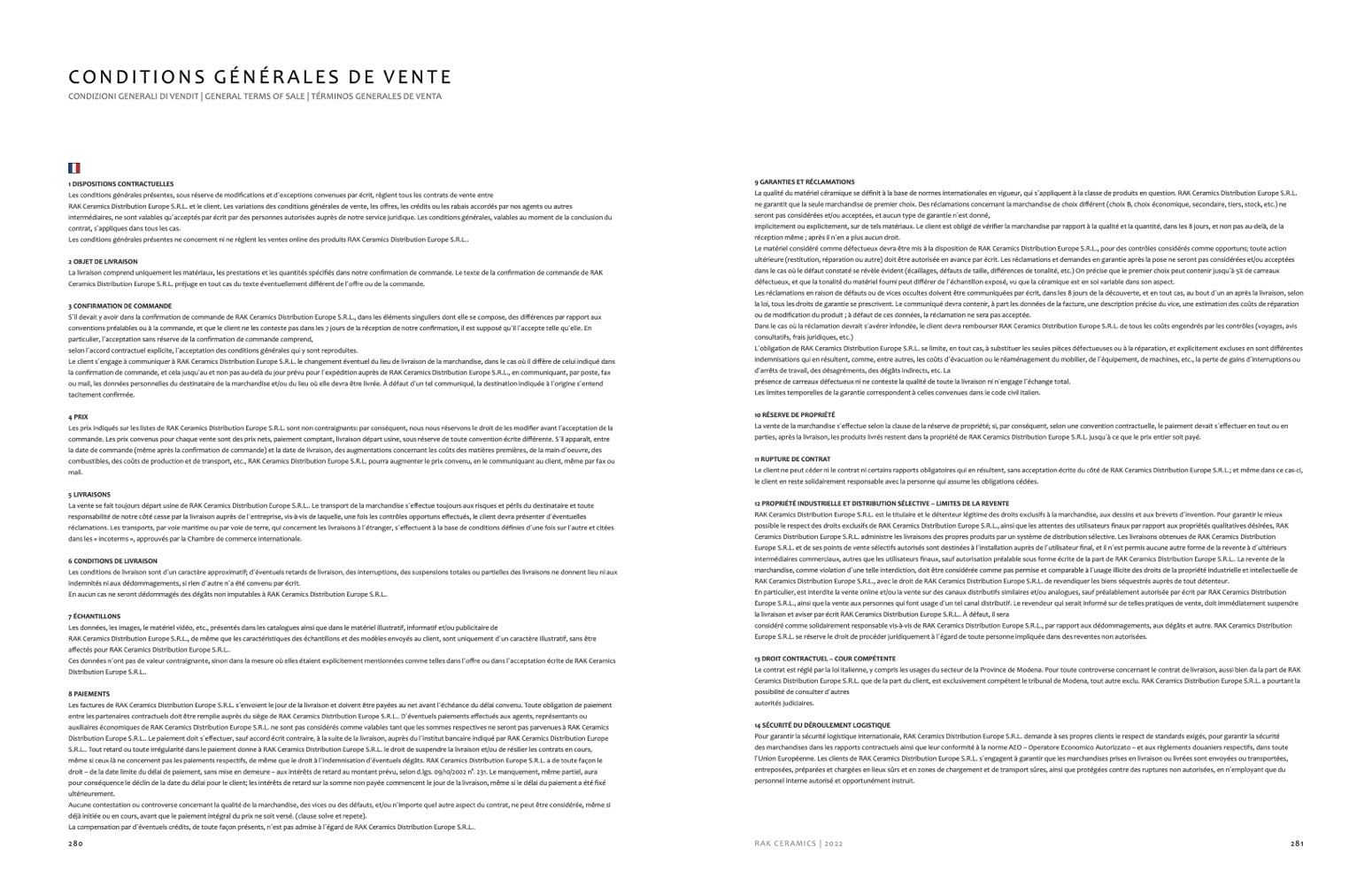 parties, après la livraison, les produits livrés restent dans la propriété de RAK Ceramics Distribution Europe S.R.L. jusqu ́à ce que le prix entier soit payé.