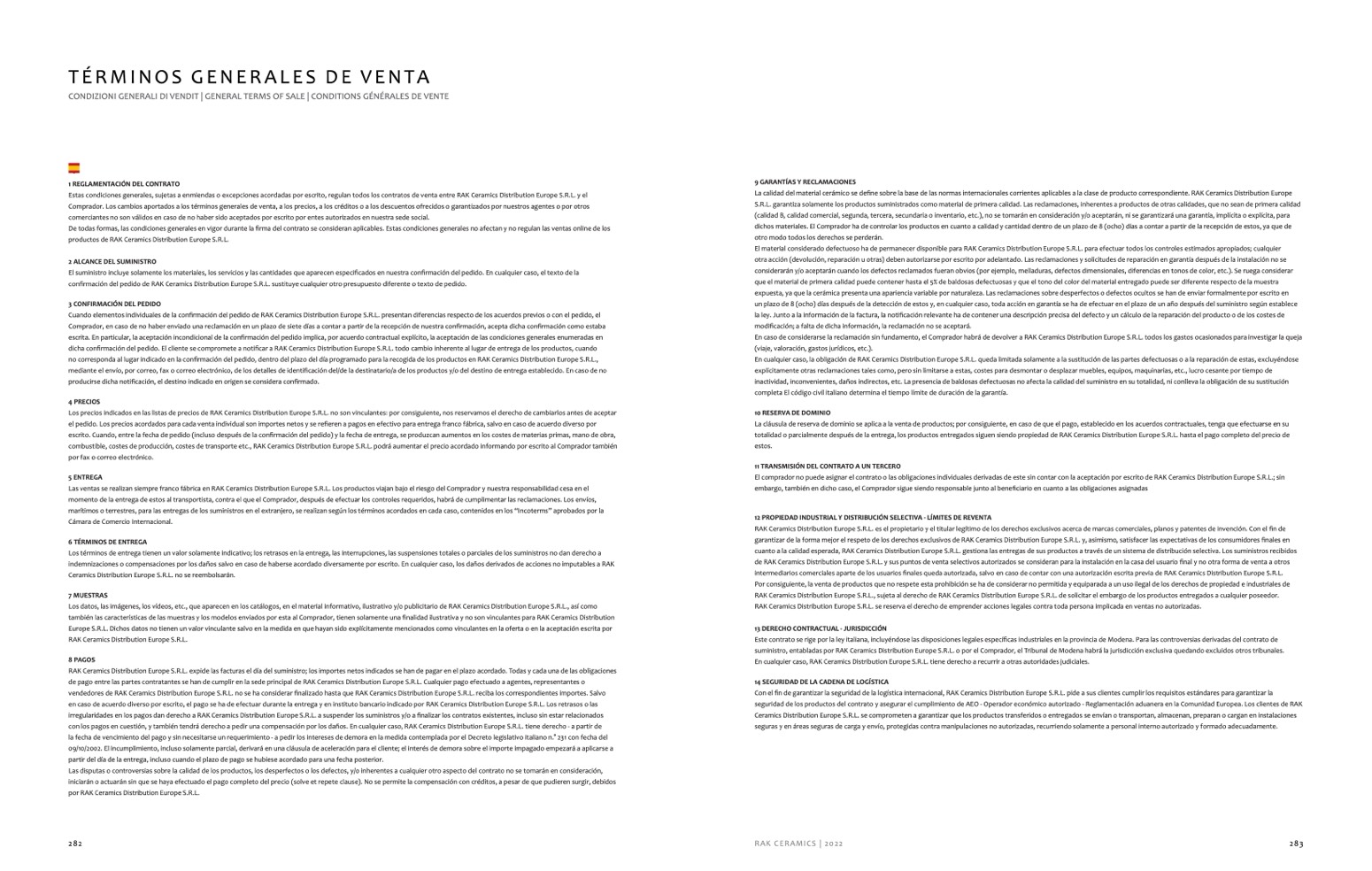 Estas condiciones generales, sujetas a enmiendas o excepciones acordadas por escrito, regulan todos los contratos de venta entre RAK Ceramics Distribution Europe S.R.L. y el