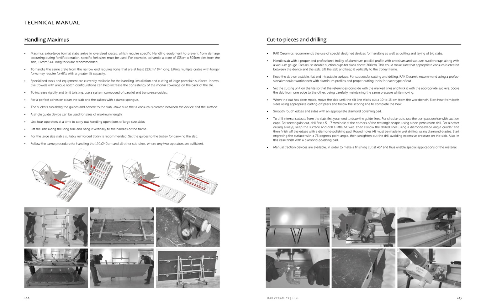 RAK Ceramics recommends the use of special designed devices for handling as well as cutting and laying of big slabs.