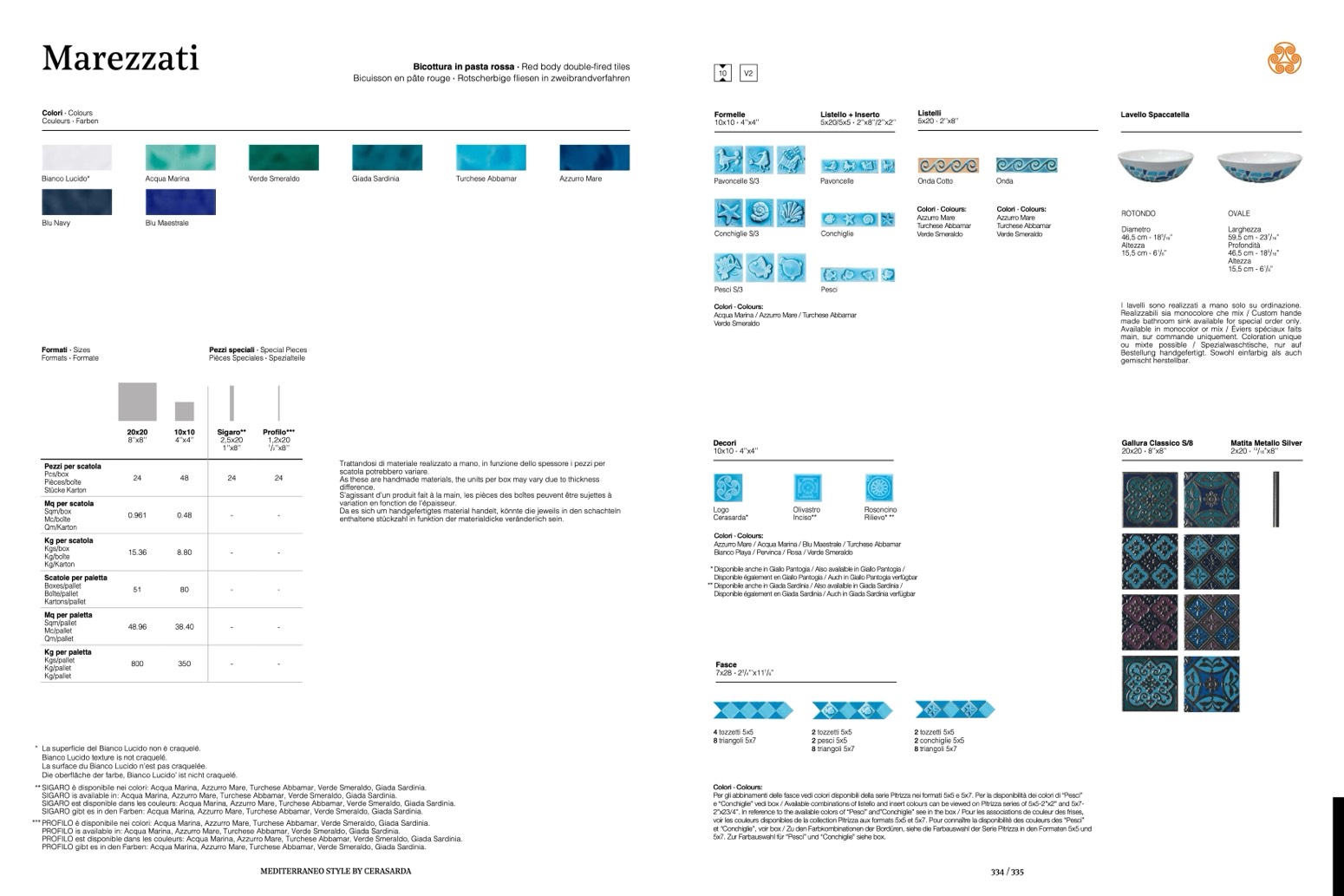 et “Conchiglie”, voir box / Zu den Farbkombinationen der Bordüren, siehe die Farbauswahl der Serie Pitrizza in den Formaten 5x5 und